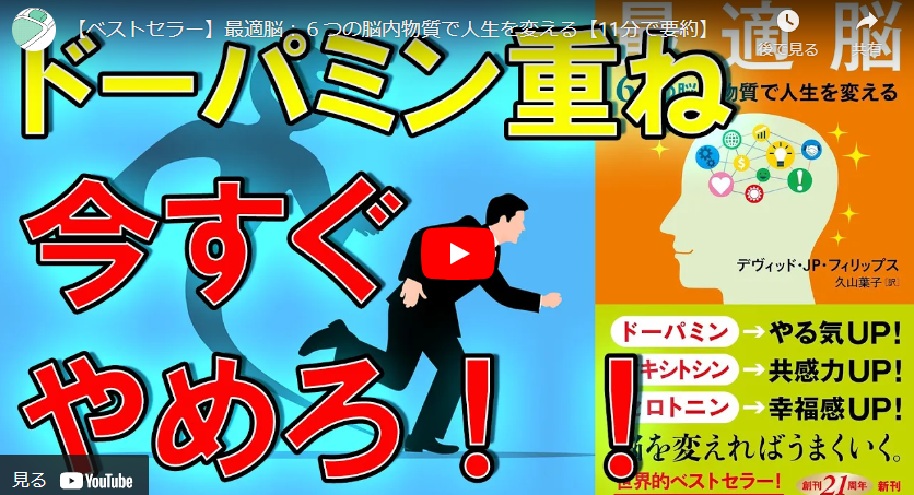 この動画は、ベストセラー本最適脳 6つの脳内物質で人生を変えるを要約したものです。本書の内容を実践することで、これらの脳内物質を効果的に作り出し、人生を良い方向へと導くことができます。6つの脳内物質人間の脳内に存在する6つの神経伝達物質(ドーパミン、オキシトシン、セロトニン、コルチゾール、エンドルフィン、テストステロン)がどのように私たちの思考や行動に影響を与えるかを解説しています。また、これらの神経伝達物質を効果的に活用する方法についても紹介されています。ドーパミンの落とし穴ドーパミンは、私たちにやる気やモチベーションを与え、行動を起こすためのエネルギーを提供する神経伝達物質です。しかし、ドーパミンには落とし穴があります。ドーパミンは、活動前や活動中に分泌されますが、活動後は分泌量が減少します。そのため、同じ刺激を繰り返し受けると、次第にドーパミンが分泌されなくなり、やる気が低下してしまうのです。現代社会では、SNSやゲーム、甘いお菓子など、ドーパミンを刺激するものが多く存在するため、知らないうちにドーパミンが枯渇してしまい、無気力や精神的な不安定さを引き起こしてしまう可能性がありま...